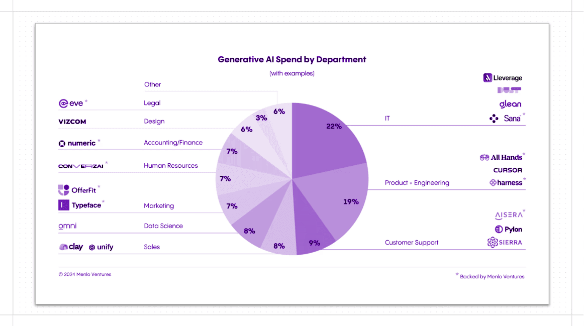 The distribution of generative AI spending across departments reveals where organizations are finding the most immediate value. Technical departments command nearly half of all AI investments: