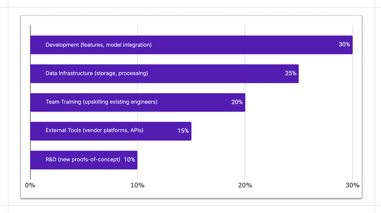 Leading “AI-forward” companies allocate 18–25% of tech budgets to AI, which is then being distributed across: