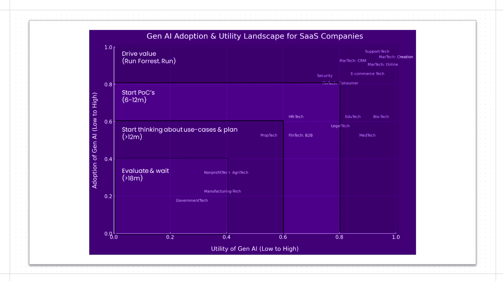 Marketing & support tech: Leading in user-facing AI, harnessing chatbots, content generation, and early-stage AI agents.