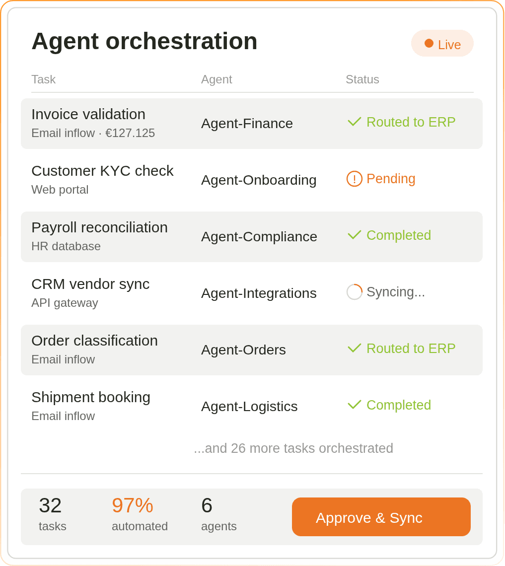 Your BPO processes the routine 70% — straightforward invoices, clean orders, standard formats. That's the part they quote you on. What they don't mention: the other 30% routes right back to your team. Mismatches, missing POs, pricing exceptions, format issues. Your people still carry the hard work. You're paying twice — the BPO contract, plus the internal time to handle everything they can't.