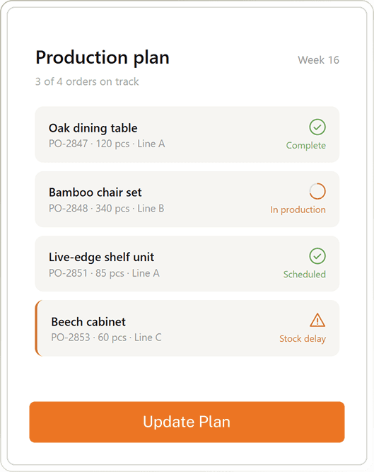 Our AI agents analyze incoming demand signals, current capacity, and material availability to generate optimized production schedules. When constraints change — a rush order, a supplier delay, a machine breakdown — the system adapts and flags what needs human attention.