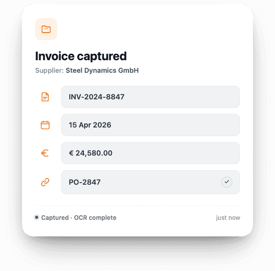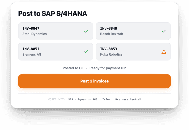 Invoice processing automation that captures supplier invoices in any format, matches them against your orders and receipts, and posts them straight to your ERP. Built for SMEs in manufacturing, logistics, and wholesale running SAP, Dynamics 365, Business Central, or Infor.