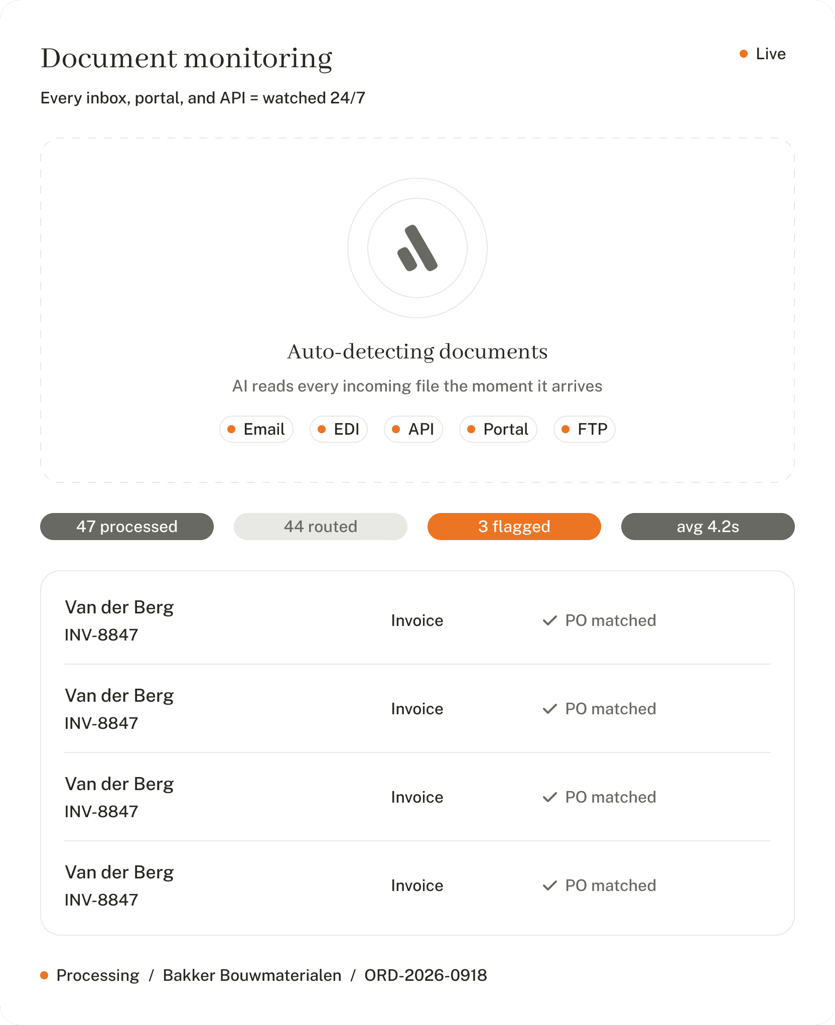 Works across formats: email, PDF, Excel, EDI, and supplier portals